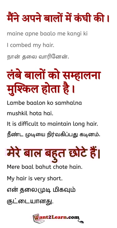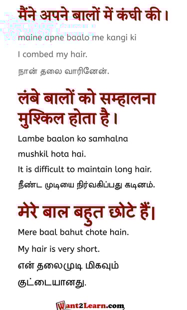 To learn Hindi we have conversations and sentence formation and more through audio video materials. You can check our youtube channel @want2learn. This book gives you the basic sentence patterns. The pronunciation and meaning are given in English. If you have any questions or doubts you can discuss this in our community