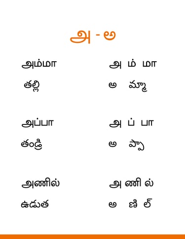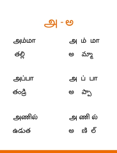 To learn Tamil we have conversations and sentence formation and more through audio video materials. You can check our youtube channel @want2learn. This basic book gives you the vowels and the related words. The pronunciation and meaning are given in English. If you have any questions or doubts you can discuss this in our community